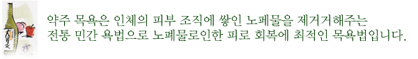 우리나라 사람들의 일반적인 목욕법은 표피까지 벗겨 낼 정도로 때를 미는 방식을 선호하는데 이는 피부를 상하게 하기 쉽고 모공 속의 노폐물까지 제거해 주지도 못합니다. 약주 목욕은 피부의 긴장을 풀어 주고 모공과 표피의 모세혈관을 넓혀 노폐물을 빼줍니다. 따라서 약주로 목욕을 한 다음 날 욕조를 보면 물의 색이 유백색으로 탁해져 있는 것을 보실 수 있답니다.