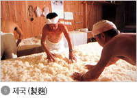 | 고들고들한 고두밥에 적당한 온도와 습도를 조절하여 국균을 번식시켜 질 좋은 코지(KOJI)를 다량으로 번식시키는 과정입니다. |