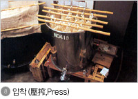 | 약18일간 발효과정을 마치면서 술덧을 압착기에 걸러내고, 술액과 찌꺼기를 분리하는 압착공정 입니다. |